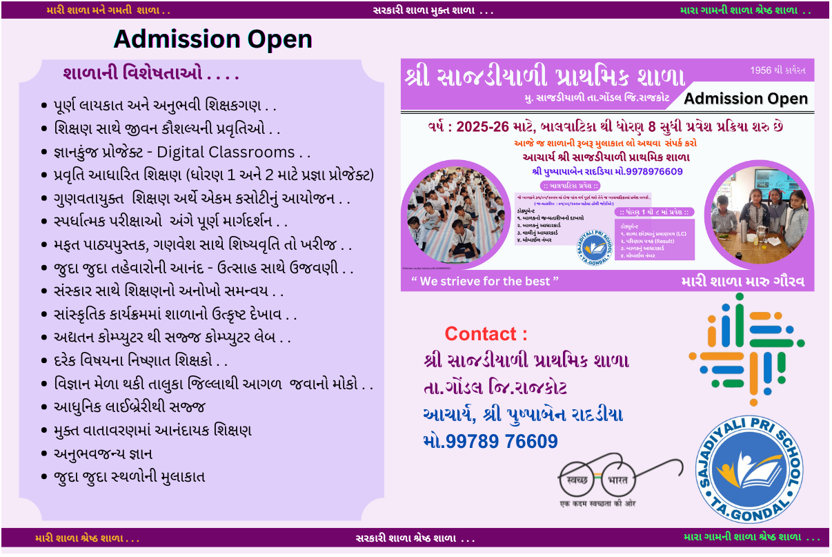વર્ષ 2025-2026 માટે બાલવાટિકા થી ધોરણ 8 સુધી શાળામાં એડમિશનની પ્રક્રિયા શરૂ છે. આપના બાળકને શાળામાં પ્રવેશ મેળવવા આજેજ શાળાની મુલાકાત લો. બાલવાટિકા અને ધોરણ 1 માં પ્રવેશ માટે બાળકનો જન્મતારીખનો દાખલો સાથે બાળકનું આધારકાર્ડ અને ધોરણ 2 થી 8 માટે શાળા છોડ્યાનું પ્રમાણપત્ર તેમજ બાળકના આધારકાર્ડની નકલ સાથે રૂબરુ સંપર્ક કરવો.